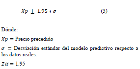 Para la estimación de estos valores se recurrió a parámetros estadísticos y ecuaciones establecidas en Devore (2008). Tal como puede apreciarse en la Xp±1.95*s (3), una vez se concluyó esto se definieron los rangos con la desviación estándar de la predicción, obteniéndose intervalos de los escenarios del precio entre los escenarios pesimista y optimista calculados, como se detalla en la Ecuación 3 y se muestra en la Figura 6.