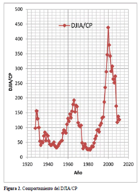 Obsérvese que en la Figura 3, en los años en los cuales los precios reales del carbón están en sus puntos más altos (máximos), se presentan valores mínimos en el comportamiento del DJIA/CP.