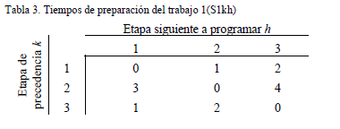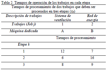 Para ilustrar de manera más amplia el comportamiento de la función objetivo en estudio, se plantea un ejemplo a través de una asignación arbitraria factible (no generada por el modelo propuesto), para ello suponga que hay dos trabajos, el primero corresponde a la instalación del sistema de ventilación y el segundo relacionado a la red de energía eléctrica, estos trabajos deben ser ejecutados en los tres tramos de la mina, y los respectivos tiempos de operación se muestran en la tabla 2, los datos son tomados del ejemplo que presenta (Lin et al., 2008) para dos trabajos y tres etapas, y los tiempos de preparación entre etapas para cada trabajo, se presentan en las tablas 3 y 4, respectivamente.