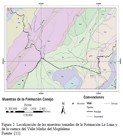 Para poder caracterizar las formaciones se tomaron cinco muestras de la Formación La Luna en la quebrada La Sorda, en el municipio de Lebrija en el departamento de Santander y seis muestras en la sección de la Formación Conejo ubicada en la vía Villa de Leyva - Tunja, en el departamento de Boyacá, ésta última formación se correlaciona con la Formación La Luna en cuanto a edad (Turoniano-Coniaciano) y litología, como ya se mencionó.
