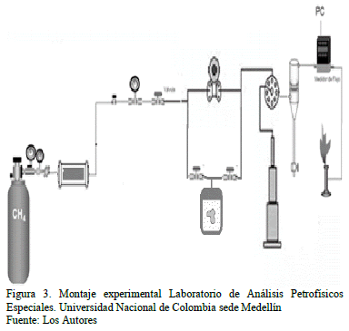 De manera particular el equipo utilizado para construir las curvas de adsorción se construyó en el Laboratorio de Análisis Petrofísicos Especiales de la Universidad Nacional de Colombia sede Medellín. Este cuenta con una unidad de inyección de gas metano (presión máxima de inyección de 1800 psi), un sistema de medida de caída de presión y un medidor de flujo volumétrico como se muestra en la Fig. 3 donde se describe en detalle el equipo utilizado.