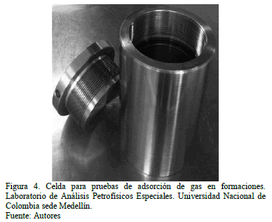 De igual manera el portamuestras empleado fue una celda fabricada especialmente para la medida de adsorción de gas en diferentes formaciones, ya sean muestras consolidadas o no consolidadas, amorfas, o en forma de tapones (Ver Fig. 4).