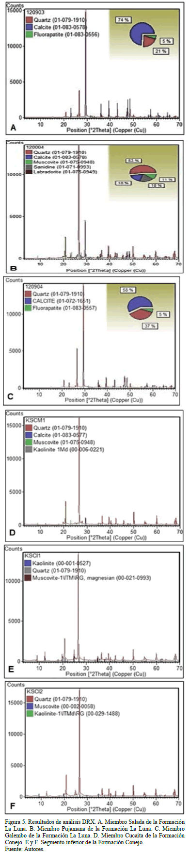 Para el miembro inferior de la Formación La Luna (Fig. 5A) se tiene principalmente calcita y cuarzo en un 80%, con predominio del primero. En el miembro medios se identificaron mayores contenidos significativos de plagioclasa y feldespato potásico (Fig. 5B) que en los otros miembros. Finalmente para el miembro superior (Fig. 5C) se obtuvieron resultados semejantes a los obtenidos para el miembro inferior. El contenido de cuarzo y carbonato representan más del 80% del contenido mineral de la muestra.