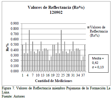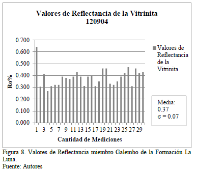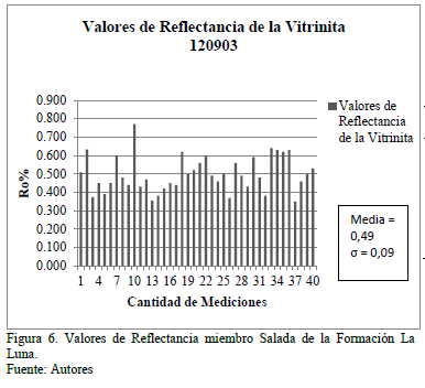 La reflectancia de la vitrinita fue obtenida en 3 muestras de la formación La Luna, para así determinar la madurez termal de la secuencia sedimentaria (Fig. 6-8).