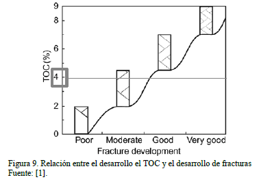 El comportamiento de la roca frente el fracturamiento está aparentemente controlado por el contenido de materia orgánica [1]. Según Ding et al. (2012), a mayor contenido de materia orgánica mayor desarrollo de fracturas (Fig. 9).