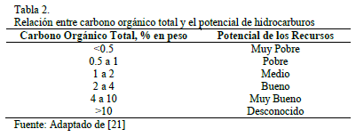 Al comparar los resultados con los rangos de calificación asignada para evaluar el potencial de generación de hidrocarburos, más del 80% de las muestras presentan un contenido de materia orgánica alto (Ver tabla 2).