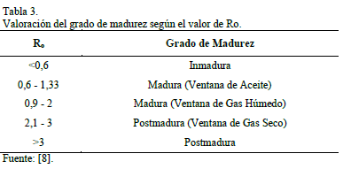Al comparar las muestras con el grado de madurez termal (Tabla 3), se obtiene que las tres muestras son inmaduras (<0,6).