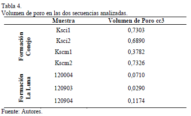 Los resultados indican que las muestras pertenecientes a la Formación Conejo en la Cordillera Oriental colombiana tienen mayores volúmenes de poro que las muestras de la Formación La Luna del Valle Medio del Magdalena.