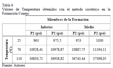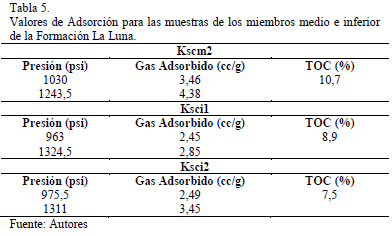 De lo anterior se tiene que los valores de adsorción son mayores en el miembro medio de la Formación Conejo, y el rango de las presiones necesarias para alcanzar estos valores de adsorción aumentando la temperatura varía entre 963 y 36939 psi para el miembro inferior y entre 953 y 37398 psi para el miembro medio.