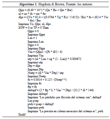 A continuación, se presenta el algoritmo diseñado para el procedimiento Hagdorn & Brown [4].