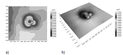 Figura 5 Modelación de anomalía de Bouguer donde el valor promedio es de -0.002101469 m/s2, el máximo de -0.001856637 m/s2 y el mínimo de 0.003398546 m/s2. a) Vista en planta del modelo de isolíneas de anomalías de Bouguer, b) Modelo 3D de las anomalías de Bouguer.