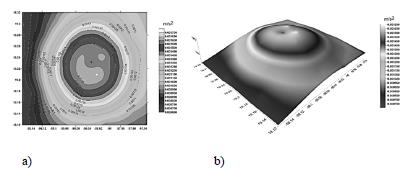 Figura 6 Modelación de anomalía de aire libre, donde el valor promedio es de 0.001297652 m/s2, el valor mínimo de 0.000656409 m/s2 y máximo de 0.001657928 m/s2. a) Vista en planta del modelo de isolíneas de anomalías de aire libre, b) Modelo 3D de las anomalías de aire libre.