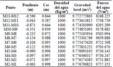 En relación a la Fig. 4 (la cual muestra los puntos que se han utilizado para calcular la fuerza del agua sobre una corriente intermitente), han sido calculados como se muestra en la Tabla 2, de acuerdo al modelo matemático descrito en el marco teórico.