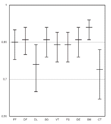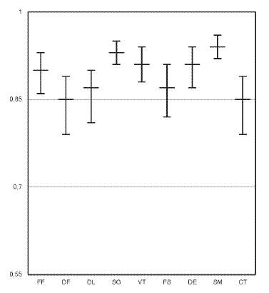 La fiabilidad de las escalas entre dos observadores distintos se ilustra en la figura 1a. Los valores de los CCI de todas las escalas fueron superiores a 0,80. En la figura 1b se muestran los resultados de los CCI para dos observaciones del mismo evaluador, que estuvieron por encima de 0,70. Solo los límites inferiores del intervalo de confianza de los CCI de las escalas DL y cambio de salud fueron menores de ese valor.