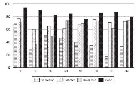 Los puntajes promedio de las escalas transformadas de los grupos de diagnóstico están en la figura 2. Todos los puntajes de los pacientes deprimidos, diabéticos y con dolor músculo-esquelético fueron menores a los sanos. En los deprimidos, los puntajes más bajos fueron en la escala salud mental (DE, SM, FS, VT); en los diabéticos, la escala de menor puntaje fue DF (60,0); entre los sujetos con dolor músculo-esquelético, la escala DF fue muy baja (37,2) y en los sanos, todos los puntajes estuvieron por encima de 70. La calificación que las personas hacen sobre su estado de salud presente comparado con el de hace un año tuvo puntajes bajos (menores de 62) en todos los grupos.