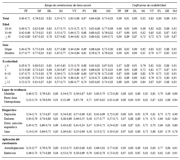 Las correlaciones ítem-escala en los grupos de edad, sexo y escolaridad fueron mayores de 0,40. La consistencia ítem-escala para los diagnósticos fue mayor de 0,40. Los coeficientes de Cronbach superaron en todos los grupos el estándar de 0,70 (tabla 4). El 56,4% (341) de las evaluaciones se hicieron por entrevista, con un promedio de edad de 47,4 años y predominio de mujeres (64%); 38,3% tenían estudios universitarios. El grupo a quienes la encuesta se hizo autodiligenciada tenía una edad media de 43,5 años, 68,2% eran mujeres y 42,6% tenían más de 11 años de escolaridad. Los puntajes promedio de las escalas fueron similares según las dos formas de aplicación. Ambos grupos tuvieron un promedio alto en las escalas DF y luego en la DE. El rango de respuestas para casi todas las escalas en ambos grupos estuvo entre 0 y 100. El comportamiento de los efectos piso y techo fue similar a los obtenidos en la muestra total y no hubo diferencias significativas entre ellos. La confiabilidad ítem-escala fue similar en los dos modos de aplicación y estuvo por encima de 0,50, excepto en FF de los entrevistados (tabla 4). Los coeficientes de Cronbach fueron similares en las dos formas y estuvieron por encima de 0,80 menos en FS de los autodiligenciados (0,77).