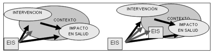 5. Sugerencia de al menos dos líneas de reflexión metodológica en el desarrollo de futuras EIS: 1) La primera, vinculada a la necesidad de profundizar en el estudio de los condicionantes contextuales en la relación entre intervenciones e impactos en salud. 2) La segunda, relacionada con la inclusión reflexiva de los efectos concurrentes del propio proceso EIS como objeto de evaluación (figura3).