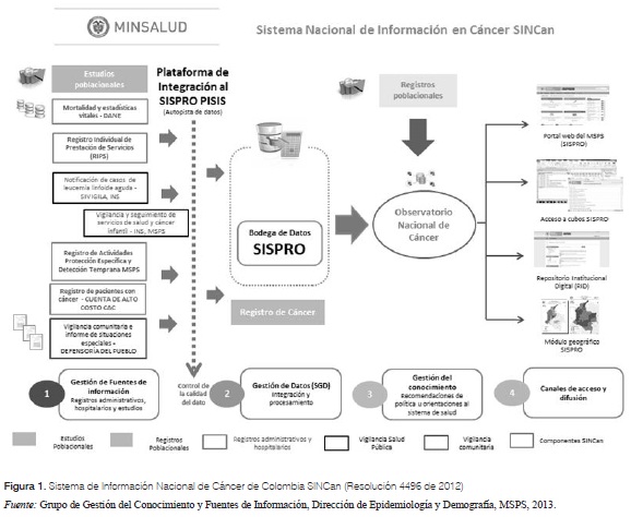 Na Colômbia o câncer é um problema de saúde pública em aumento, que representa grandes repercussões psicoafetivas, sociais e econômicas impondo um desafio para o sistema de saúde. Segundo as estatísticas do Globocan, para a Colômbia no ano 2012, ao redor de 104 pessoas morreram cada dia e 196 pessoas adoeceram de câncer.Isto exige gerar intervenções oportunas, eficazes e articuladas para alavancar os fatores protetores, aumentar a detecção precoce, reduzir a deficiência e mortalidade evitáveis, melhorar a qualidade de vida dos pacientes afetados, bem como garantir um desempenho custo-efetivo do sistema sanitário. Embora sejam apresentadas umas curtas cifras para analisar o panorama do câncer no país, não é a intenção deste artigo fornecer informação estatística já disponível no Ministério da Saúde e Assistência Social, no Instituto Nacional de Cancerologia INC, no Instituto Nacional de Saúde INS e nos Registros Populacionais de Câncer no país. Em vez disso, este artigo descreve, grosso modo, os avanços e progressos do Observatório Nacional de Câncer (ONC) Colômbia no quadro do Sistema de Informação Nacional em Câncer SINCan, salientando as fontes de informação em câncer disponíveis em SISPRO, o conjunto de indicadores para monitorar o panorama no país, os planos de análise e as saídas de informação (canais de acesso e divulgação da evidência e publicações relevantes) como ferramentas necessárias para gerenciar adequadamente o conhecimento sobre mortalidade, morbilidade, acesso a serviços e ações para reduzir as desigualdades em câncer na Colômbia.