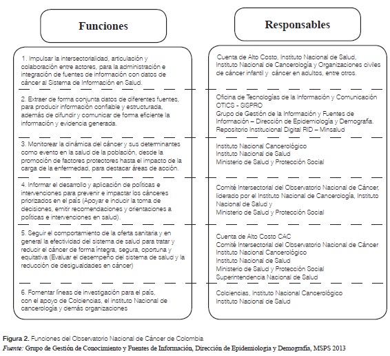 En consecuencia, el rol del observatorio es gestionar el conocimiento a partir de las fuentes conjuntas de información para abordar el cáncer como un problema de salud pública, y contribuir con la orientación de estrategias para reducir la carga de enfermedad y desigualdades sociales por esta causa en Colombia. La figura 2 ilustra las funciones del ONC Colombia con sus responsables.