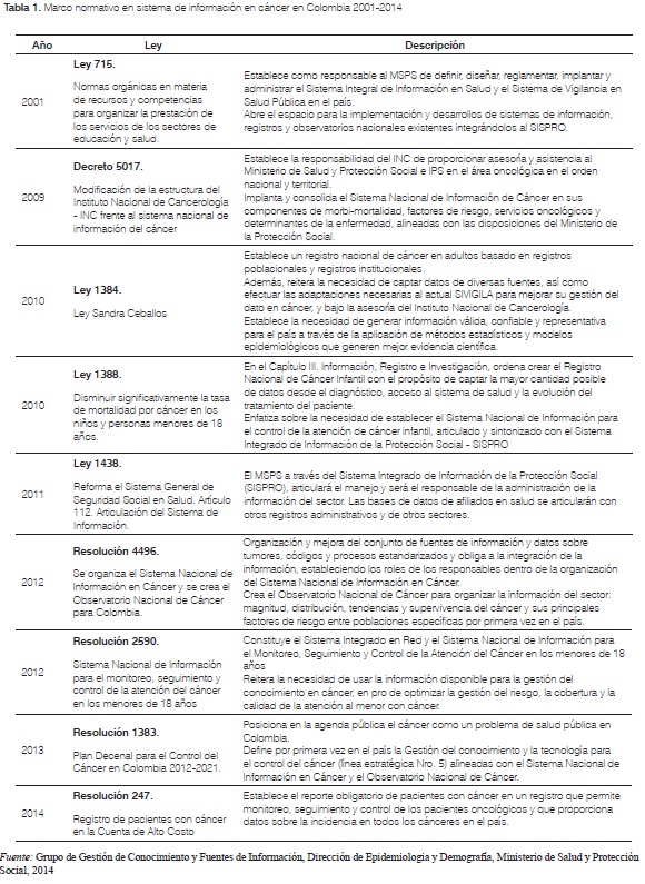 Las políticas que apoyan el sistema de información, el observatorio y la gestión de conocimiento en cáncer en Colombia pueden considerarse como uno de los marcos políticos más amplios y completos hasta ahora en el país. La tabla 1 recapitula brevemente y en orden cronológico aquellas bases normativas que han permitido dar alcance y apoyar el desarrollo del ONC Colombia.