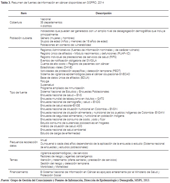 In Colombia, cancer is a public health problem on the rise that has major psycho-affective, social and economic repercussions. This poses a challenge for the health system. According to the statistics presented by Globocan, in 2012 approximately 104 people died each day in Colombia from this disease, and 196 developed it. This requires generating timely, effective and articulated interventions to promote protective factors, increase early detection, reduce avoidable disability and mortality, improve the quality of life of affected patients and ensure cost-effective health system performance. Although brief figures are presented to review the status of cancer in the country, this paper's authors do not intend to provide statistical data that has already been made available by the Ministry of Health and Social Protection, the National Cancer Institute, the National Institute of Health and the Cancer Population Records of Colombia. Instead, this article aims to broadly describe the progress and developments of the National Cancer Observatory (NCO) of Colombia within the National Information System on Cancer (SINCan). It also describes the cancer information sources available in SISPRO, the set of indicators to monitor the status of this disease in the Country, the analysis plans and the information output mechanisms (channels of access and dissemination of evidence and relevant publications) as the necessary tools to properly manage the knowledge on mortality, morbidity, health service access and actions to reduce cancer inequalities in Colombia.