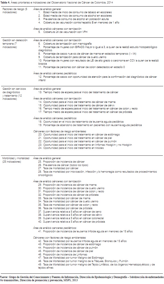 Los indicadores priorizados por el observatorio para hacer seguimiento, monitoreo y evaluación a la situación del cáncer en el país, se han agrupado a través de 4 áreas prioritarias, las cuales se definen a partir de los componentes de la historia natural de la enfermedad así como de la respuesta del sistema de salud frente a la situación de cáncer, y son: