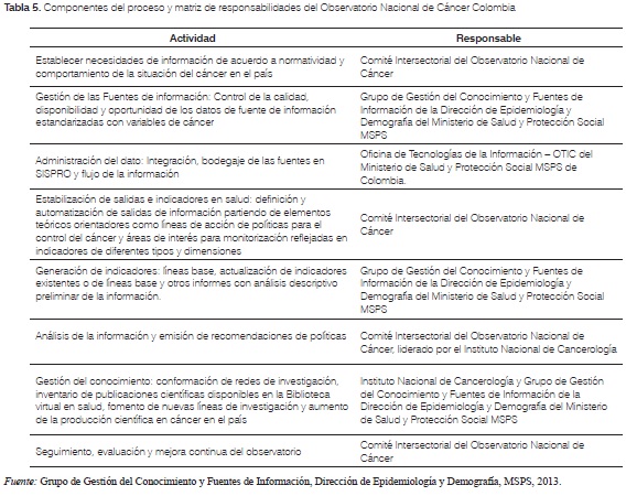 En la tabla 5 se sintetizan los componentes del proceso que se engranan para permitir la conducción del onc. Este es un proceso circular que espera asegurar su calidad, basado en el círculo de la calidad conocido como PHVA (planear, hacer, verificar y actuar), el cual tiene como producto final: “seguimiento, evaluación y mejora” que será el insumo de la actividad inicial de “establecer necesidades de información”.