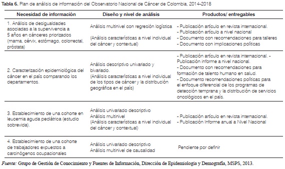 A través del diseño de estudios estadísticos y epidemiológicos bajo criterios de investigación claramente establecidos, el ONC Colombia propone aumentar la evidencia disponible y disminuir las brechas de información. Estos estudios no sólo deben usar y explotar la información disponible y derivada del Sistema de Gestión de Datos SGD SISPRO, si no también generar nuevo conocimiento en las áreas de análisis prioritarias descritas anteriormente. La tabla 6 ilustra las áreas de análisis definidas como temas monitoreados por el Observatorio Nacional de Cáncer.