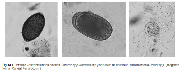 Se determinó la presencia de ooquistes de coccidios, probablemente Eimeria spp (55%), Capillaria spp (27,5%) y Ascaridia spp (7,5%); y en algunos casos se realizó aislamiento de diferentes parásitos en el mismo individuo; tres palomas evidenciaron Capillaria spp y Ascaridia spp, mientras que cinco reportaron Capillaria spp y ooquistes de coccidios (Figura 1).