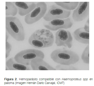 Respecto a la presencia de hemoparásitos, aunque se han reportado estudios donde se ha aislado Plasmodium sp de palomas ferales [18], en este estudio sólo se reportó la presencia de Haemoproteus spp. Este es considerado como uno de los protozoarios patógenos en aves que afectan el sistema circulatorio, éstos fueron encontrados en una alta proporción en el estudio (72,5%), superior a los reportados en el Oriente Medio (62%) [19] y Brasil (67%) [10]; y por debajo de prevalencias reportadas en áfrica (80%) [20] y España (82%) [21]. No se encontraron reportes de transmisión de Haemoproteus spp de aves a humanos.