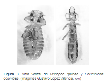 El 64% de las aves muestreadas presentaron Columbicola columbae, 52% Pseudolynchia canariensis y 24% Menopon gallinae (Figura 3 y Figura 4).