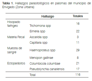 La presencia de Trichomonas spp orales en palomas es común; sin embargo, no se encontró sintomatología clínica asociada a éstas. De igual forma en coherencia con la literatura se encontró la presencia de Menopon gallinae y Columbicola columbae, esta última con mayor frecuencia.
