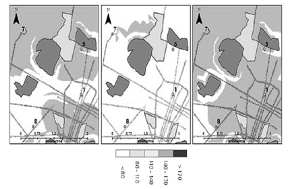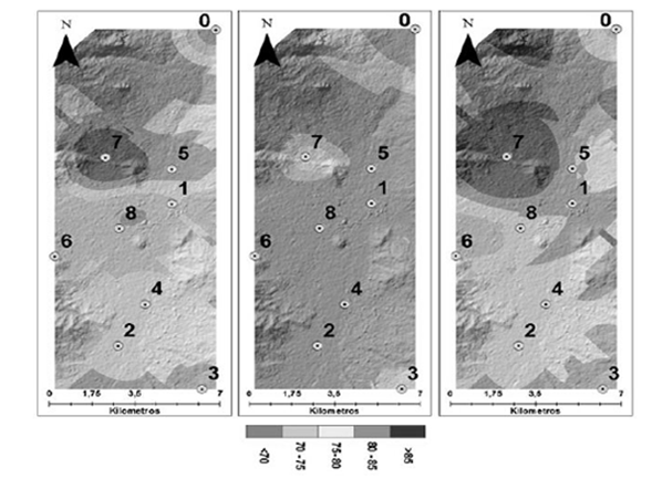 Las Figuras 7 a 9 muestran el efecto que tiene la proximidad a fuentes emisoras (que tienden a aumentar la concentración) y a fuentes disipadoras (que tienden a disminuir la concentración) al momento de localizar adecuadamente los sitios de monitoreo que midan la concentración del material particulado. Estos resultados son la base para proponer la configuración de una red de vigilancia que adicionalmente debería tener en cuenta: