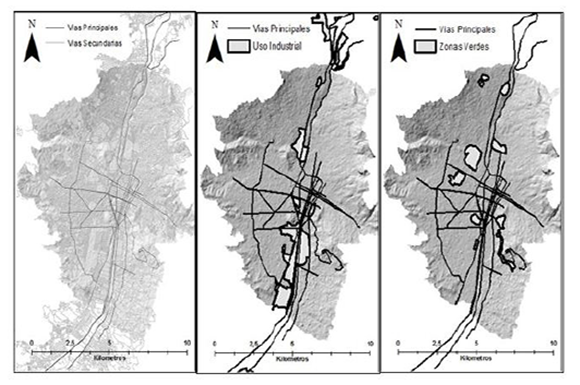 Otras entradas en el modelo son: un mapa de vías secundarías, un mapa de vías principales, un mapa de usos industriales del suelo y un mapa de zonas verdes.