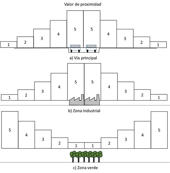 Figura 4 Esquema de valoración del efecto de contaminación por proximidad: a) a vías principales, b) a centros de zonas industriales y c) a centros de zonas verdes. Obsérvese que la proximidad de las zonas verdes es contraria a las otras dos, ya que su efecto es amortiguador de la contaminación.