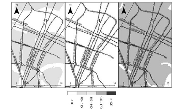 Las vías que atraviesan usos industriales y zonas verdes por el efecto triple que aumenta la concentración por proximidad a la vía y a las industrias, y simultáneamente la atenúa por proximidad a las zonas verdes.