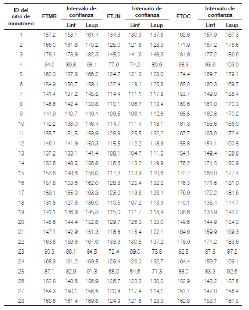 Con una configuración de sitios de monitoreo como la propuesta en la Figura 10, sería posible realizar campañas de mediciones preliminares de material particulado, relocalizar y complementar los sitios de monitoreo existentes y hacer mediciones para correlacionarlas con los efectos sobre la salud debidos a la exposición directa y de largo plazo a este contaminante. Adicionalmente se estimó el valor mensual en cada sitio de monitoreo de la Tabla 2 y se calculó su intervalo de confianza. En la Tabla 3 se muestran los cálculos para los meses de marzo (FTMR), junio (FTJN) y octubre (FTOC).