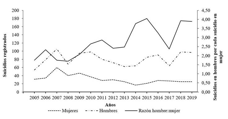 La diferencia relativa de las muertes por suicidio entre hombres y mujeres se mantuvo al alza durante el periodo de estudio (valor p= 0,032). En este sentido, en el 2005 se registraron 1,7 suicidios en hombres por cada suicidio en mujeres; para 2019, la razón ascendió a 3,9 suicidios en hombres por cada mujer suicida.