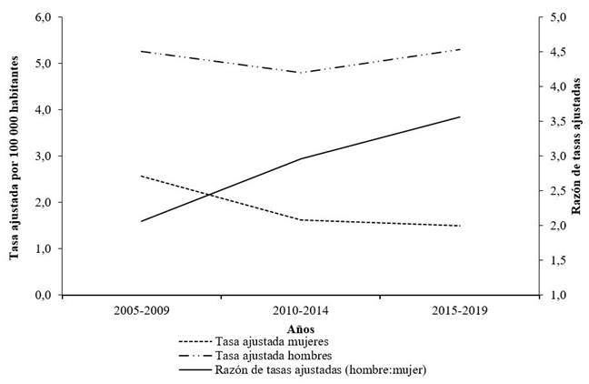Las diferencias de las tasas ajustadas de suicidio entre hombres y mujeres han aumentado; en el quinquenio 2005-2009, el riesgo de morir por suicidio de los hombres fue 2,1 veces el riesgo de las mujeres; estas brechas se incrementaron, y para el periodo 2015-2019, el riesgo de morir por suicidio en los hombres fue 3,6 veces el riesgo de las mujeres (véase Figura 2].