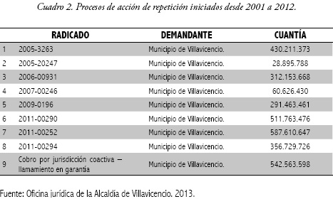 La Alcaldía de Villavicencio facilitó a la investigación la información sobre los procesos de repetición que se habían iniciado entre los años 2001 a 2012, y los casos en los que había pagado indemnizaciones ya sea por condenas o por vía de conciliación en casos de responsabilidad contra la Administración. La información obtenida arrojó que en 308 casos el Municipio de Villavicencio canceló indemnizaciones por concepto de sentencias y conciliaciones por daños cometidos por funcionarios del Municipio. Entre los años 2005 y 2012 se iniciaron nueve procesos de acción de repetición en el Municipio de Villavicencio, que suman pecuniariamente un total de $3.122.018.167; cifra alta, si se tiene en cuenta que se registra en un tiempo relativamente corto. Respecto a la efectividad de la acción de repetición generalizada vs condenas y conciliaciones canceladas, se evidencia un porcentaje del 3% de procesos iniciados con respecto a las condenas o conciliaciones canceladas por la entidad; un 0% de efectividad de la acción de repetición, si se tiene en cuenta que desde hace 12 años se emitió la ley y aún no se profiere sentencia en favor del ente municipal.