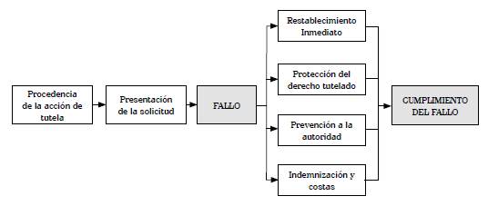 De este modo, en el procedimiento de la acción de tutela se pueden distinguir cuatro etapas, I) la procedencia de la acción de tutela, entendida como aquellos presupuestos necesarios para la presentación de la acción de tutela, II) la presentación de la solicitud, la cual se refiere a los trámites necesarios para la presentación, correcciones y notificaciones a las partes en el proceso, III) el fallo, que consiste en la decisión del juez restablecer inmediatamente un derecho, proteger un derecho tutelado, prevenir a la autoridad y generar la indemnización y costas y, finalmente, IV) cumplimiento de fallo, el cual cumple la función de verificar la ejecución de las órdenes del Juez Constitucional, es decir, que el accionado cumpla dentro de los términos establecidos por la Ley y la Constitución.