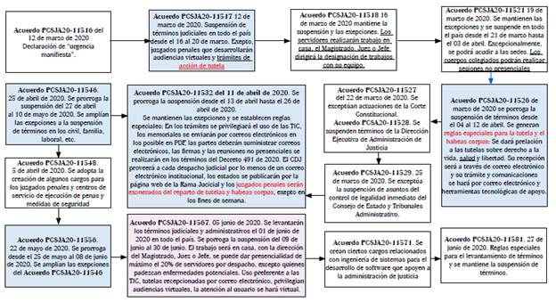 El Acuerdo PCSJA20-115467 del 25 de abril de 2020 prorroga la suspensión de términos desde el 27 de abril hasta el 10 de mayo de 2020. El Acuerdo PCSJA20-11548 del 05 de abril de 2020 que adopta la creación de algunos cargos para algunos juzgados y centros de servicios de ejecución de penas y medidas de seguridad nivel nacional. El Acuerdo PCSJA20-11556 del 22 de mayo de 2020, el cual prorroga la suspensión de términos judiciales desde el 25 de mayo hasta el 08 de junio de 2020, ampliando las excepciones establecidas en el Acuerdo PCSJA20-11546 del 25 de abril de 2020.