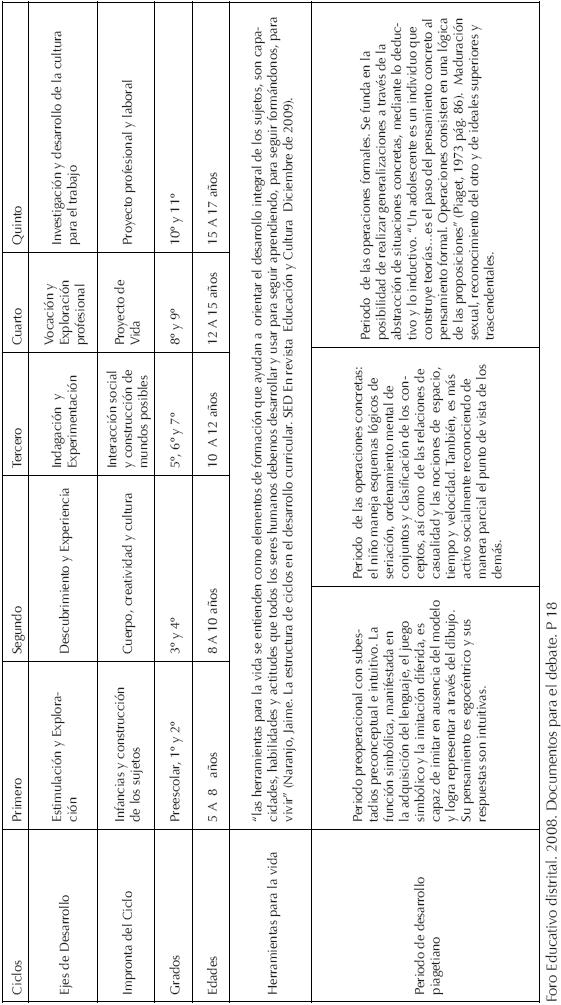La referencia a las etapas del desarrollo es fundamental en la propuesta por ciclos, tanto a nivel conceptual como organizativo y, aunque la teoría piagetiana no se nombra explícitamente, es posible reconocer elementos propios de ella: "...centrar los procesos de enseñanza y aprendizaje en el reconocimiento de las particularidades y necesidades de los niños, niñas y jóvenes durante las diferentes etapas de desarrollo, propiciando las condiciones que faciliten el acceso integral al conocimiento" (Ibíd., Pág. 3).