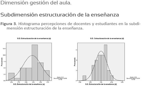 Los datos muestran (figura 3) que los estudiantes caracterizan a los docentes con puntajes en un nivel medio alto, lo que indica que perciben que estos son altamente estructurados de acuerdo con la media (3,21); no se observan puntajes limítrofes ya que el puntaje mínimo es de 2,44 y el máximo 3,70. En relación a los docentes, los datos muestran que estos se perciben a sí mismos aún más estructurados, en comparación con la percepción de los estudiantes, alcanzando una media de 3,50, lo que los ubica también en un nivel medio alto; presentan a su vez un puntaje mínimo de 2,00 y uno máximo de 4,00. Se observa una diferencia significativa (t=-3,750, p=0,001) de las medias, entre los puntajes dados por los estudiantes y los docentes; sin embargo, se presenta una correlación negativa (p=-0,096) no significativa entre ambas. Las dos variables parecen mostrarse independientes en su comportamiento, aun así, se observa la misma tendencia en los puntajes dados por docentes y estudiantes.