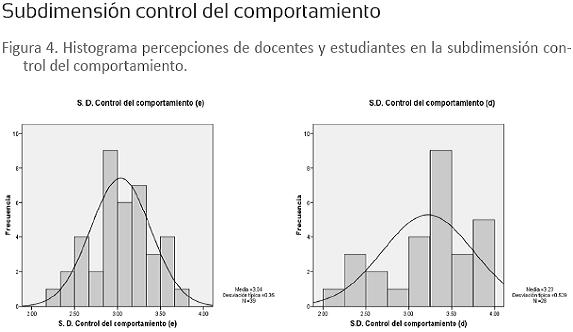 En la figura 4 se observa que los estudiantes caracterizan a los docentes en general como altamente controladores frente a su comportamiento en clase. Obtienen una media de 3,04. El puntaje mínimo es 2,24 y el puntaje máximo 3,71, lo que indica que en todas las clases los docentes son caracterizados en un nivel medio alto de la escala. De la misma forma, los docentes se perciben a sí mismos como controladores del comportamiento ubicándose también en un nivel medio alto, aunque con una media mayor (3,22), un puntaje mínimo de 2,00 y uno máximo de 3,86. Se identifica que las diferencias de las medias entre los puntajes dados por los estudiantes y los docentes es significativa (t=-2,141, p=0,041),sin embargo, presentan una correlación, entre ambas, positiva mas no significativa (p=251). Lo anterior muestra una coincidencia en las percepciones entre ambos actores.
