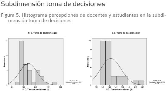 En relación con los docentes los datos muestran que estos se perciben a sí mismos como personas que comparten la toma de decisiones con sus estudiantes aunque en un mayor nivel, en comparación con la percepción de los estudiantes, alcanzando una media de 1,24 ubicándose también en un nivel bajo; presentan a su vez una puntaje mínimo de 1,00 y uno máximo de 2,17. Se observa una diferencia de las medias significativa (t=4,613, p=0,000), entre los puntajes dados por los estudiantes y los docentes; sin embargo, se presenta una correlación negativa (p=-0,077), no significativa, entre ambas. Las dos variables parecen mostrarse independientes en su comportamiento, sin embargo se observa la misma tendencia en los puntajes dados por docentes y estudiantes.