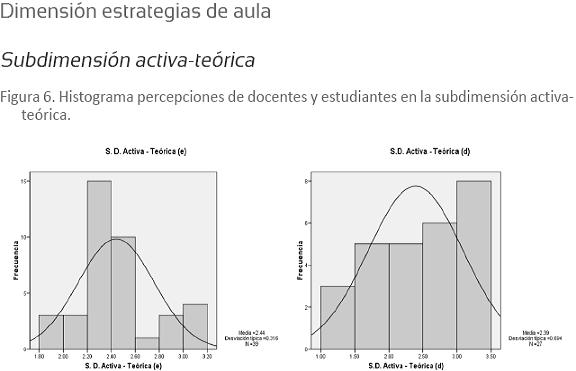 En la gráfica 6 se observa que los estudiantes perciben que los docentes emplean estrategias de aula de tipo teorías y activas en igual medida durante la clase. Obtienen una media de 2,44. El puntaje mínimo es 1,82 y el puntaje máximo 3,18, lo que indica que en general los docentes son caracterizados en el nivel medio de la escala. Por su parte, observamos que los docentes se caracterizan a sí mismos también en un nivel medio aunque con una media menor (2,39) con un puntaje mínimo de 1,13 y uno máximo de 3,44. Se identifica que no hay diferencias entre las medias de los puntajes dados por los estudiantes y los docentes (t=0,148, p=0,883), sin embargo, presentan una correlación nula entre ambas (p=0,02). Lo anterior muestra una coincidencia en las percepciones entre ambos actores aunque las variables se comportan de forma independiente.