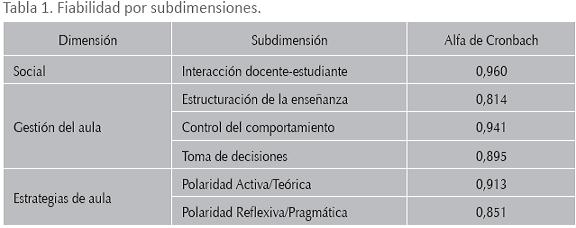 Se realiza análisis de fiabilidad para determinar la consistencia de las subdimensiones que componen el instrumento. Se observa que cada una se obtiene excelentes niveles de confiabilidad siendo superiores en todos los casos a 0,7, valor que corresponde al mínimo habitualmente aceptado para que un instrumento pueda ser empleado. Se subraya que todas las subdimensiones presentan valores de correlaciones ítem-total corregidas mayores a 0,30.En la tabla 1 es posible ver los valores obtenidos a partir del análisis de alfa de Cronbach para cada subdimensión.