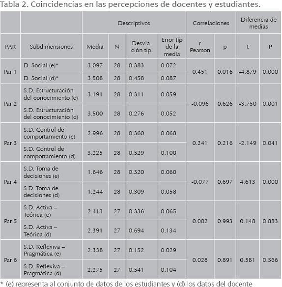 La tabla 2 presenta el resumen de los datos mostrando para cada subdimensión las medias, sus diferencias y las correlaciones dadas entre las percepciones de docentes y estudiantes.