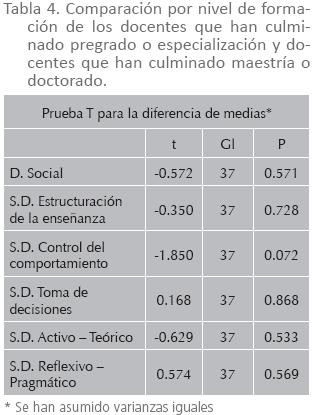 Los datos no arrojan diferencias significativas entre los dos grupos mostrando que el nivel de formación no influye en ninguna de las dimensiones del estilo de enseñanza (tabla 4). Sin embargo se señala que la diferencia más importante se presenta en la subdimensión control del comportamiento, siendo los docentes que han culminado pregrado o especialización más controladores que aquellos que han culminado una maestría o doctorado.